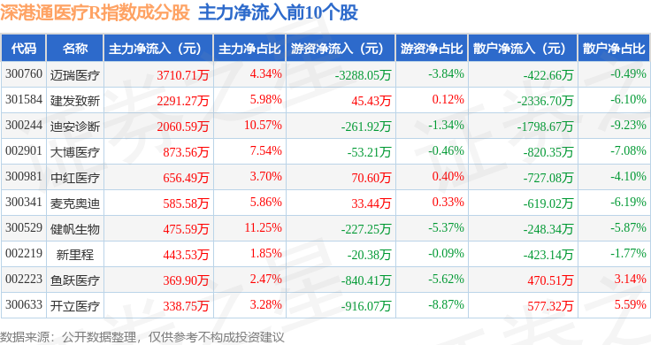 资金流向方面,深港通医疗R(483035)指数成份股当日主力资金净流出合计8377.16万元,游资资金净流入合计2269.62万元,散户资金净流入合计6107.53万元。成份股资金流向详情见下表: