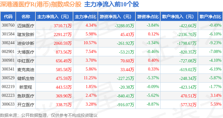 资金流向方面,深港通医疗R(港币)(483036)指数成份股当日主力资金净流出合计8377.16万元,游资资金净流入合计2269.62万元,散户资金净流入合计6107.53万元。成份股资金流向详情见下表: