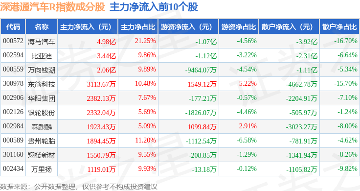 资金流向方面,深港通汽车R(483039)指数成份股当日主力资金净流入合计1.03亿元,游资资金净流出合计2.35亿元,散户资金净流入合计1.32亿元。成份股资金流向详情见下表: