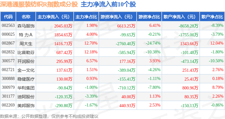 资金流向方面,深港通服装纺织R(483041)指数成份股当日主力资金净流出合计2.9亿元,游资资金净流入合计1.41亿元,散户资金净流入合计1.49亿元。成份股资金流向详情见下表: