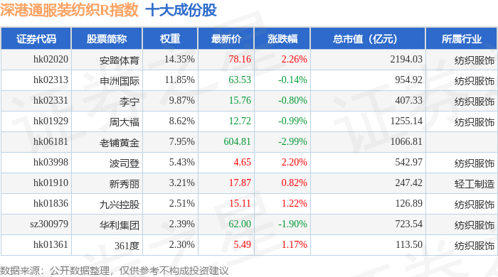 深港通服装纺织R(483041)指数十大成份股详情如下:
