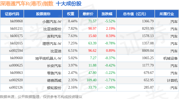 深港通汽车R(港币)(483040)指数十大成份股详情如下: