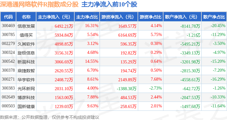 资金流向方面,深港通网络软件R(483047)指数成份股当日主力资金净流出合计35.83亿元,游资资金净流入合计13.06亿元,散户资金净流入合计22.77亿元。成份股资金流向详情见下表: