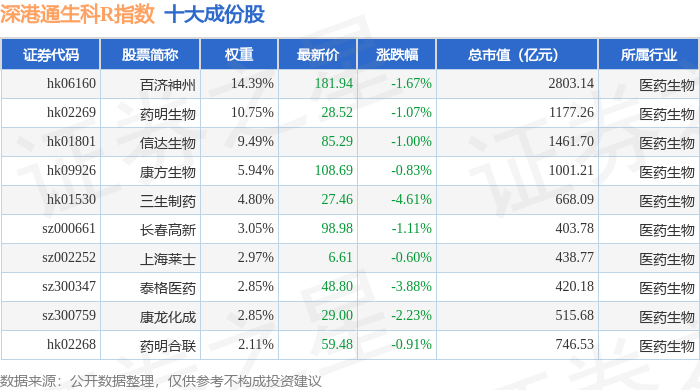 证券之星消息,12月2日,深港通生科R(483059)指数报收于7835.01点,跌1.73%,成交97.98亿元,换手率0.71%。当日该指数成份股中,上涨的有1家,博晖创新以0.85%的涨幅领涨,下跌的有59家,三生制药以4.61%的跌幅领跌。