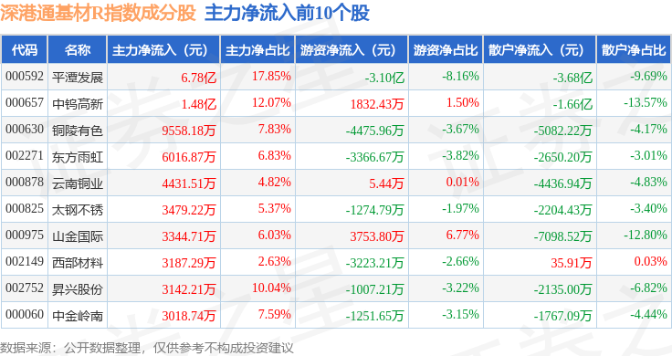 资金流向方面,深港通基材R(483061)指数成份股当日主力资金净流出合计20.82亿元,游资资金净流出合计4.22亿元,散户资金净流入合计25.04亿元。成份股资金流向详情见下表: