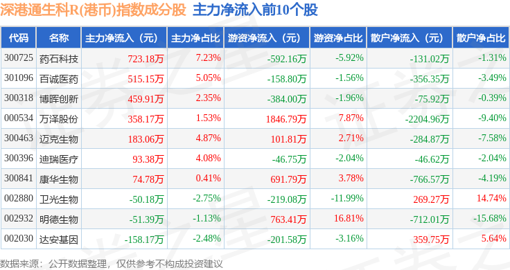 资金流向方面,深港通生科R(港币)(483060)指数成份股当日主力资金净流出合计4.61亿元,游资资金净流入合计1.56亿元,散户资金净流入合计3.05亿元。成份股资金流向详情见下表: