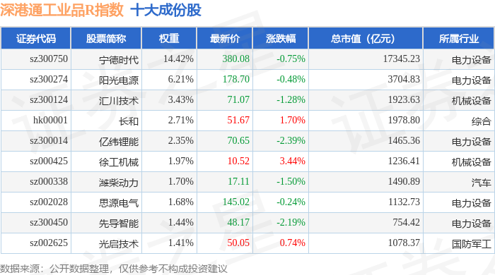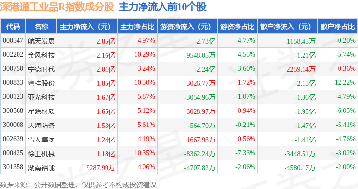 资金流向方面,深港通工业品R(483069)指数成份股当日主力资金净流出合计50.79亿元,游资资金净流入合计6.45亿元,散户资金净流入合计44.33亿元。成份股资金流向详情见下表: