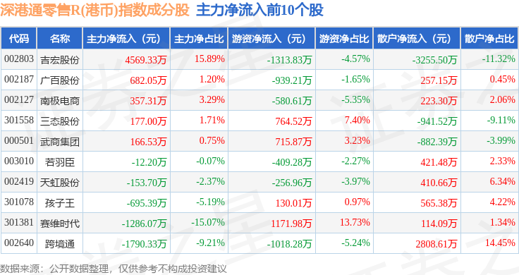 资金流向方面,深港通零售R(港币)(483074)指数成份股当日主力资金净流出合计3.79亿元,游资资金净流入合计422.05万元,散户资金净流入合计3.75亿元。成份股资金流向详情见下表: