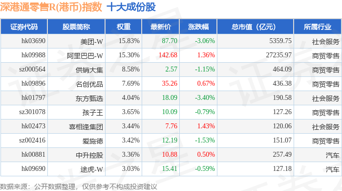 深港通零售R(港币)(483074)指数十大成份股详情如下: