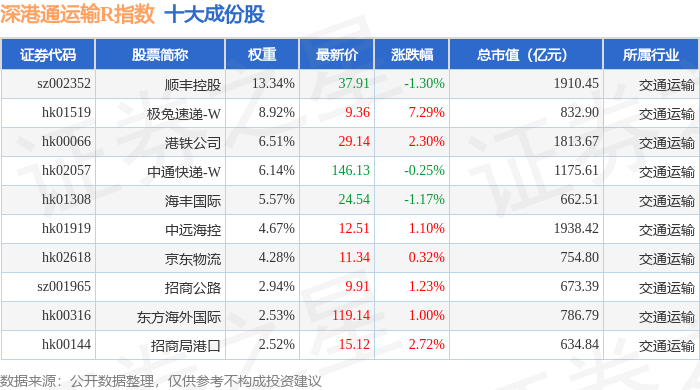 深港通运输R(483077)指数十大成份股详情如下:
