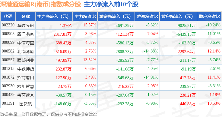 资金流向方面,深港通运输R(港币)(483078)指数成份股当日主力资金净流出合计2.06亿元,游资资金净流出合计2623.19万元,散户资金净流入合计2.32亿元。成份股资金流向详情见下表: