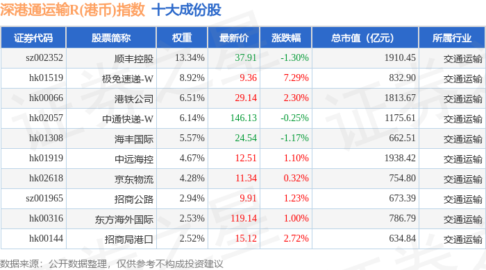 深港通运输R(港币)(483078)指数十大成份股详情如下:
