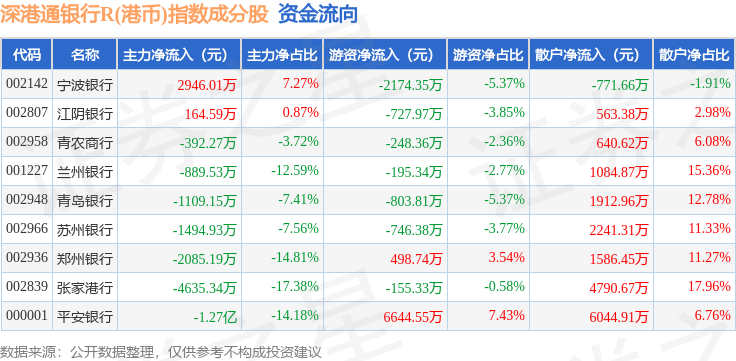 资金流向方面,深港通银行R(港币)(483082)指数成份股当日主力资金净流出合计2.02亿元,游资资金净流入合计2091.74万元,散户资金净流入合计1.81亿元。成份股资金流向详情见下表: