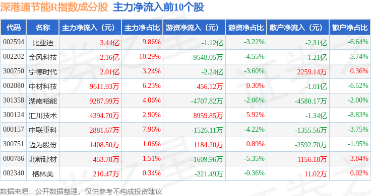 资金流向方面,深港通节能R(483085)指数成份股当日主力资金净流出合计20.49亿元,游资资金净流入合计4303.55万元,散户资金净流入合计20.06亿元。成份股资金流向详情见下表: