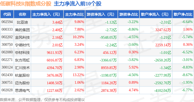 资金流向方面,低碳科技R(483160)指数成份股当日主力资金净流出合计33.14亿元,游资资金净流出合计1047.48万元,散户资金净流入合计33.24亿元。成份股资金流向详情见下表: