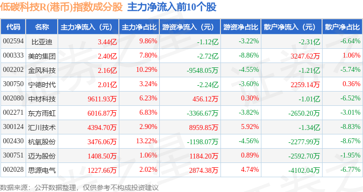资金流向方面,低碳科技R(港币)(483161)指数成份股当日主力资金净流出合计33.14亿元,游资资金净流出合计1047.48万元,散户资金净流入合计33.24亿元。成份股资金流向详情见下表: