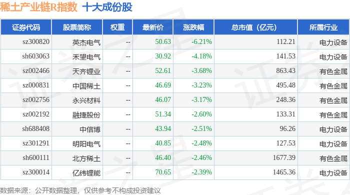稀土产业链R(489013)指数十大成份股详情如下: