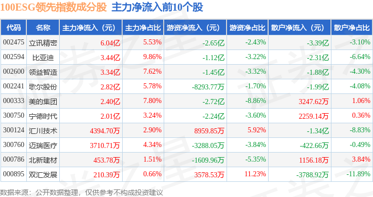资金流向方面,100ESG领先(970030)指数成份股当日主力资金净流出合计58.52亿元,游资资金净流入合计10.42亿元,散户资金净流入合计48.1亿元。成份股资金流向详情见下表: