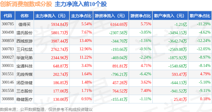 资金流向方面,创新消费(970041)指数成份股当日主力资金净流出合计15.96亿元,游资资金净流入合计4.83亿元,散户资金净流入合计11.13亿元。成份股资金流向详情见下表: