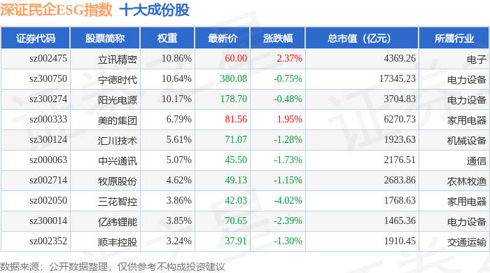 证券之星消息,12月2日,深证民企ESG(970056)指数报收于2029.87点,跌0.75%,成交868.17亿元,换手率2.0%。当日该指数成份股中,上涨的有10家,立讯精密以2.37%的涨幅领涨,下跌的有40家,三花智控以4.02%的跌幅领跌。