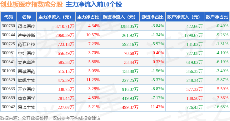 资金流向方面,创业板医疗(970082)指数成份股当日主力资金净流出合计3.15亿元,游资资金净流入合计7138.66万元,散户资金净流入合计2.44亿元。成份股资金流向详情见下表: