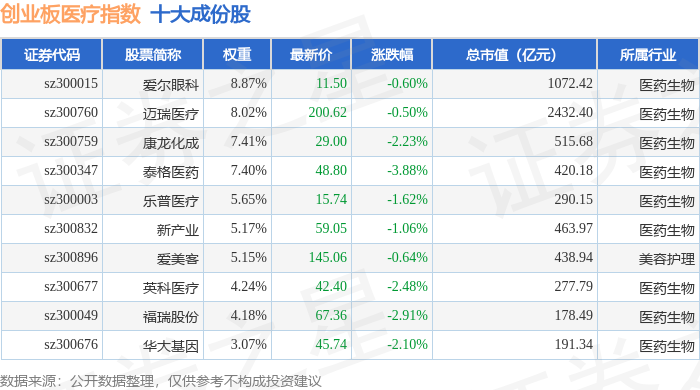 创业板医疗(970082)指数十大成份股详情如下: