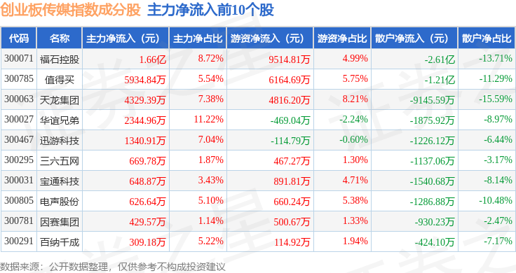 资金流向方面,创业板传媒(970084)指数成份股当日主力资金净流出合计13.38亿元,游资资金净流入合计5.44亿元,散户资金净流入合计7.94亿元。成份股资金流向详情见下表:
