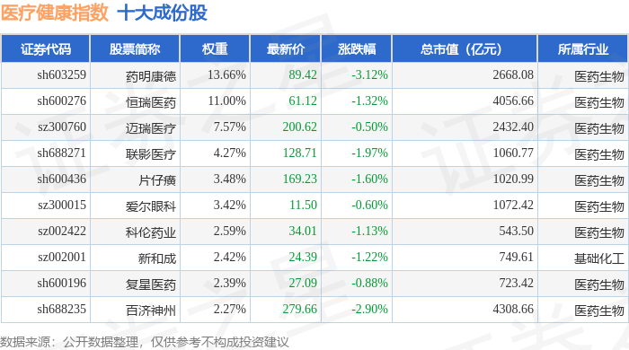 资金流向方面,医疗健康(980016)指数成份股当日主力资金净流出合计14.47亿元,游资资金净流入合计4.03亿元,散户资金净流入合计10.43亿元。成份股资金流向详情见下表: