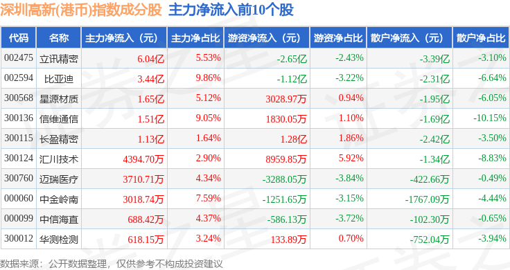 资金流向方面,深圳高新(港币)(980039)指数成份股当日主力资金净流出合计36.53亿元,游资资金净流入合计15.12亿元,散户资金净流入合计21.41亿元。成份股资金流向详情见下表:
