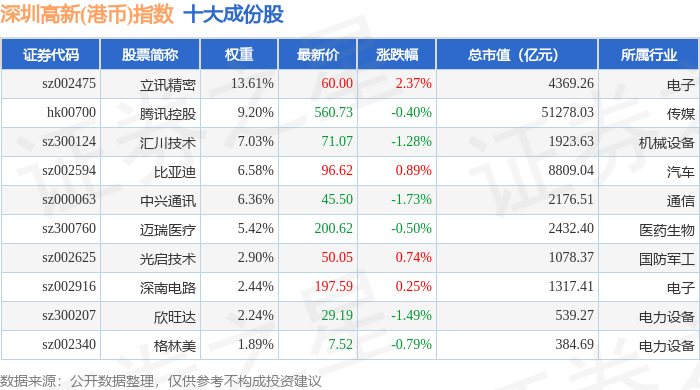深圳高新(港币)(980039)指数十大成份股详情如下: