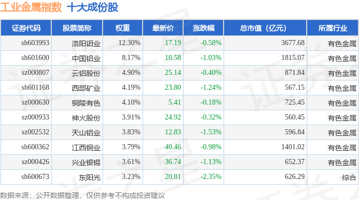 工业金属(980043)指数十大成份股详情如下: