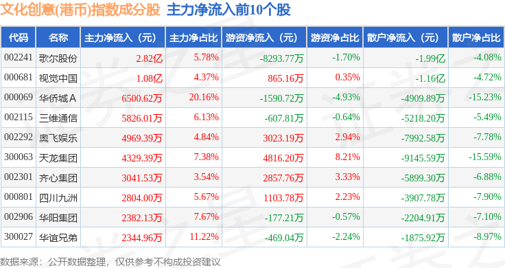 资金流向方面,文化创意(港币)(980047)指数成份股当日主力资金净流出合计24.04亿元,游资资金净流入合计7.68亿元,散户资金净流入合计16.37亿元。成份股资金流向详情见下表: