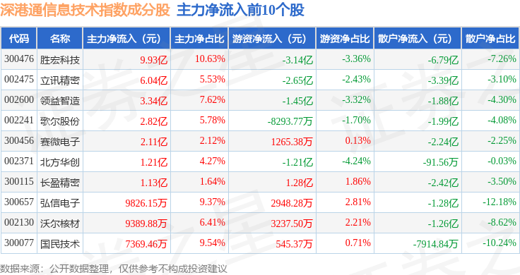 资金流向方面,深港通信息技术(983027)指数成份股当日主力资金净流出合计87.4亿元,游资资金净流入合计21.37亿元,散户资金净流入合计66.03亿元。成份股资金流向详情见下表: