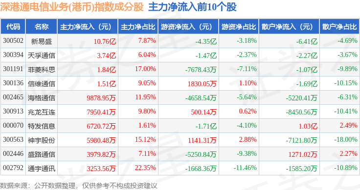 资金流向方面,深港通电信业务(港币)(983030)指数成份股当日主力资金净流出合计38.62亿元,游资资金净流入合计9.37亿元,散户资金净流入合计29.25亿元。成份股资金流向详情见下表: