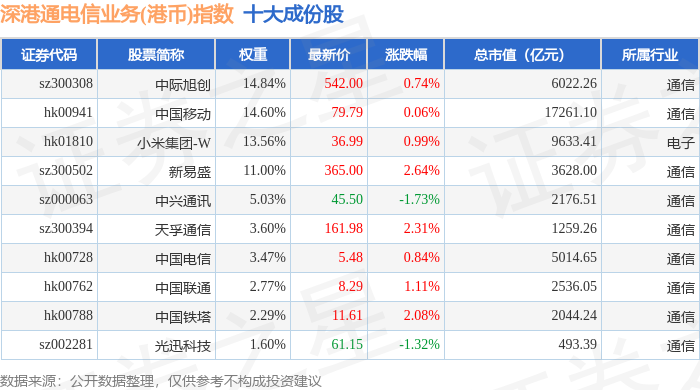 深港通电信业务(港币)(983030)指数十大成份股详情如下: