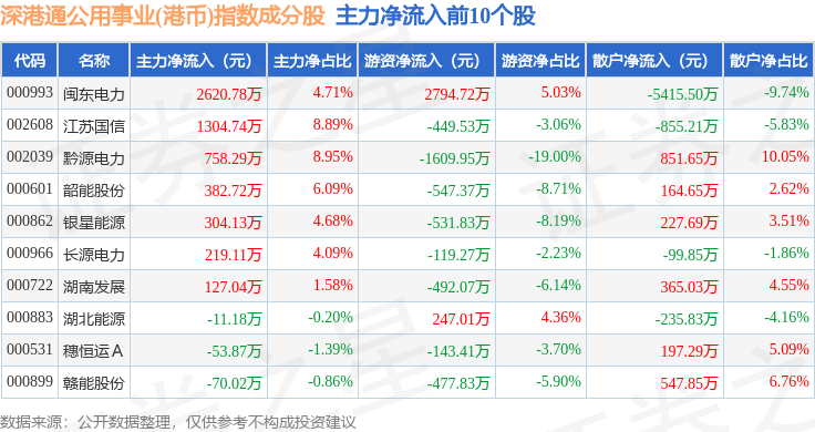 资金流向方面,深港通公用事业(港币)(983032)指数成份股当日主力资金净流出合计3.04亿元,游资资金净流入合计3732.16万元,散户资金净流入合计2.67亿元。成份股资金流向详情见下表: