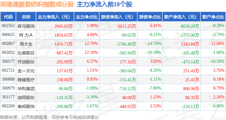 资金流向方面,深港通服装纺织(983041)指数成份股当日主力资金净流出合计2.9亿元,游资资金净流入合计1.41亿元,散户资金净流入合计1.49亿元。成份股资金流向详情见下表: