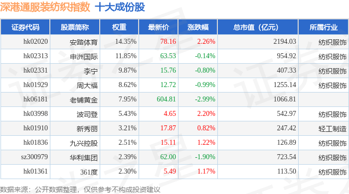 深港通服装纺织(983041)指数十大成份股详情如下:
