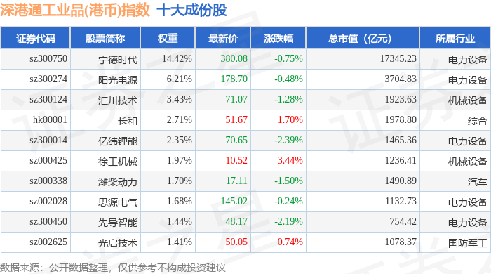 深港通工业品(港币)(983070)指数十大成份股详情如下: