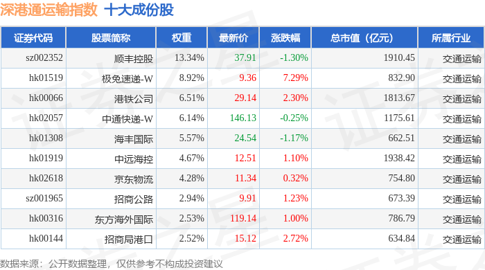 深港通运输(983077)指数十大成份股详情如下: