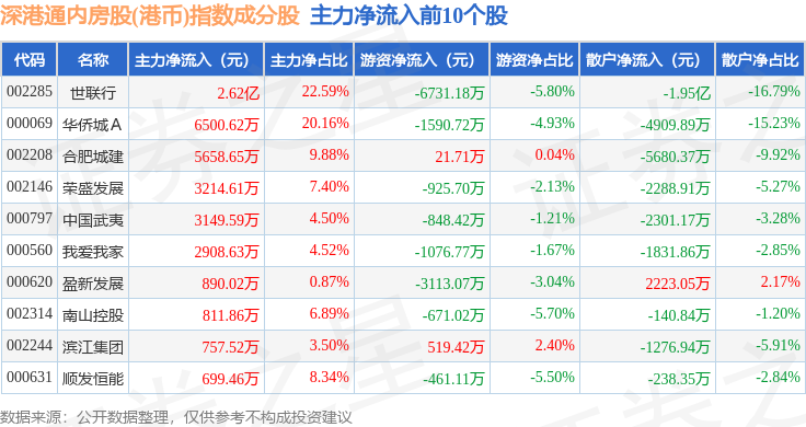 资金流向方面,深港通内房股(港币)(983084)指数成份股当日主力资金净流入合计3.82亿元,游资资金净流出合计1.48亿元,散户资金净流出合计2.34亿元。成份股资金流向详情见下表: