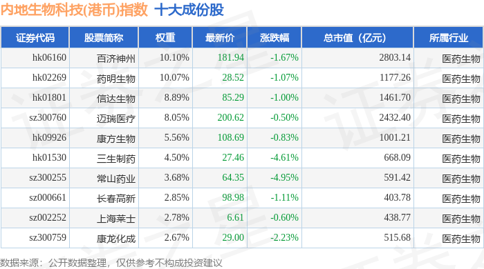 内地生物科技(港币)(983102)指数十大成份股详情如下: