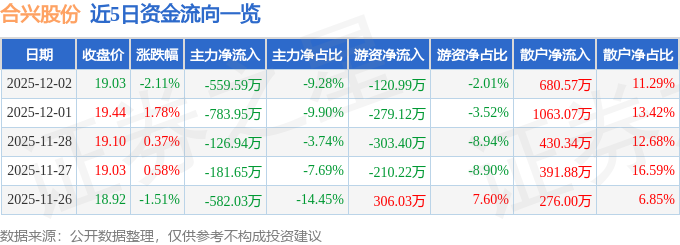 证券之星消息,截至2025年12月2日收盘,合兴股份(605005)报收于19.03元,下跌2.11%,换手率0.79%,成交量3.15万手,成交额6029.31万元。