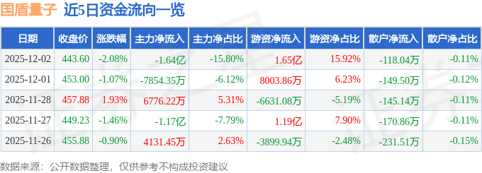 证券之星消息,截至2025年12月2日收盘,国盾量子(688027)报收于443.6元,下跌2.08%,换手率2.89%,成交量2.33万手,成交额10.35亿元。