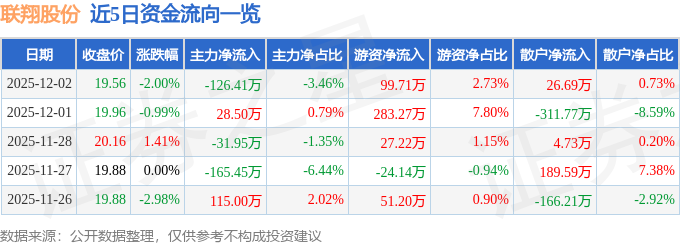 12月2日的资金流向数据方面,主力资金净流出126.41万元,占总成交额3.46%,游资资金净流入99.71万元,占总成交额2.73%,散户资金净流入26.69万元,占总成交额0.73%。