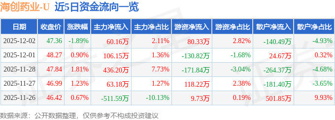 证券之星消息,截至2025年12月2日收盘,海创药业(688302)报收于47.36元,下跌1.89%,换手率0.61%,成交量6001.0手,成交额2850.41万元。