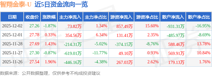 证券之星消息,截至2025年12月2日收盘,智翔金泰(688443)报收于27.26元,下跌1.87%,换手率1.72%,成交量2.01万手,成交额5495.96万元。