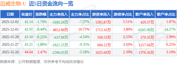 证券之星消息,截至2025年12月2日收盘,迈威生物(688062)报收于42.14元,下跌1.79%,换手率2.66%,成交量5.43万手,成交额2.3亿元。