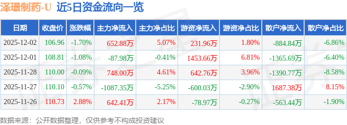 证券之星消息,截至2025年12月2日收盘,泽璟制药(688266)报收于106.96元,下跌1.7%,换手率0.45%,成交量1.2万手,成交额1.29亿元。