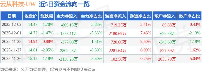 证券之星消息,截至2025年12月2日收盘,云从科技(688327)报收于14.47元,下跌1.7%,换手率1.75%,成交量14.55万手,成交额2.11亿元。